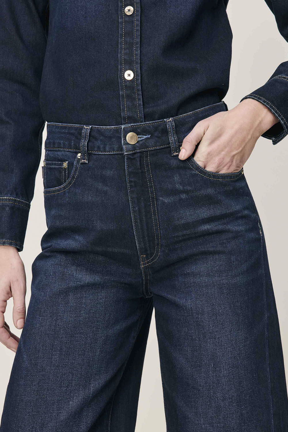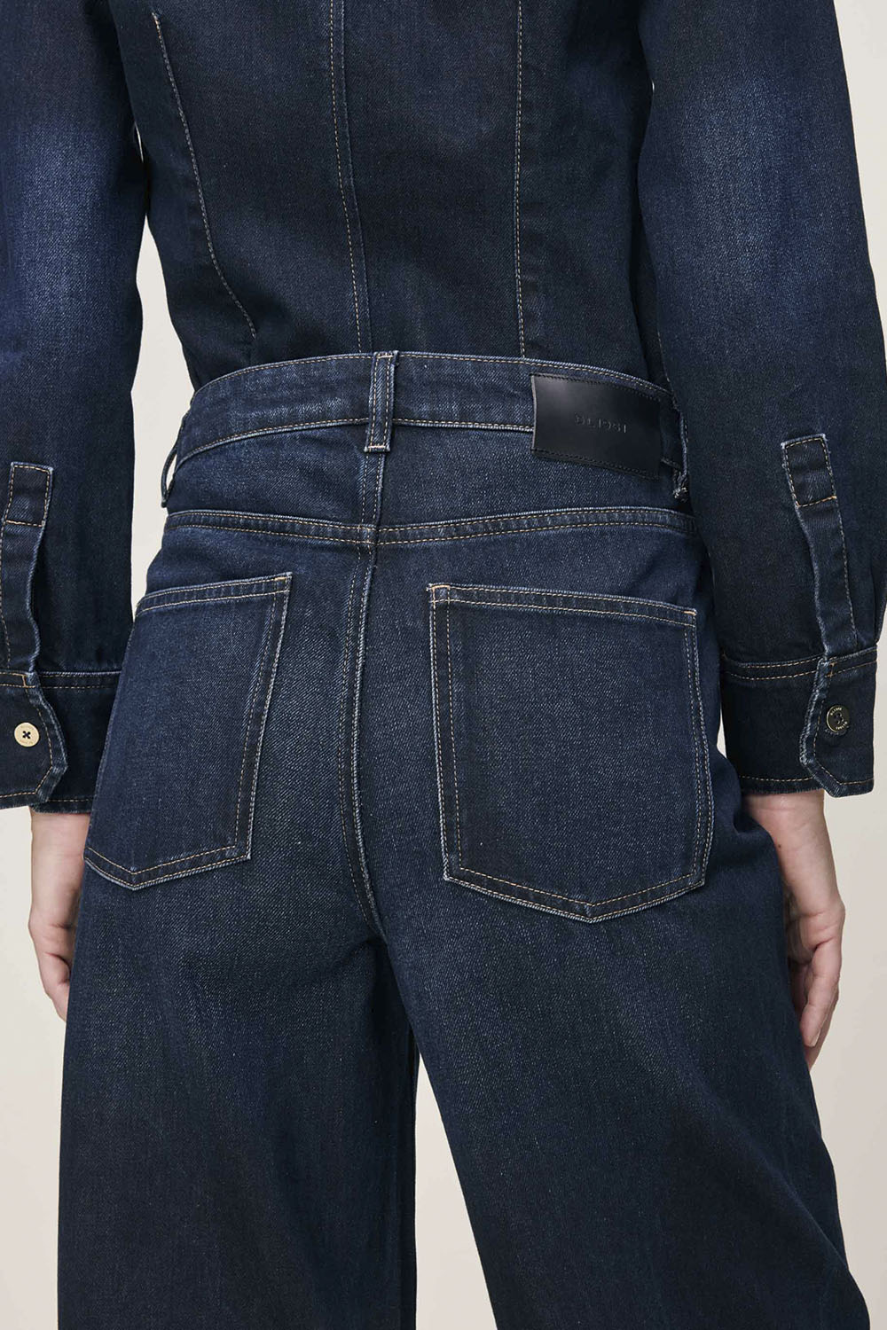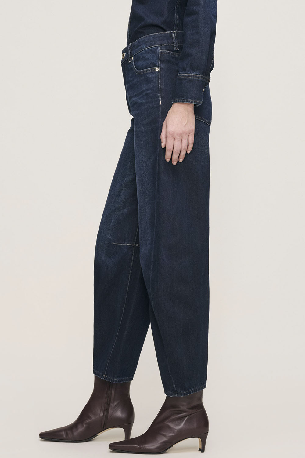 Miro is a high-rise denim with barrel leg that is fitted at the hip and tapering at the leg. Ventura is a dark rinse denim featuring gold hardware and khaki stitching.