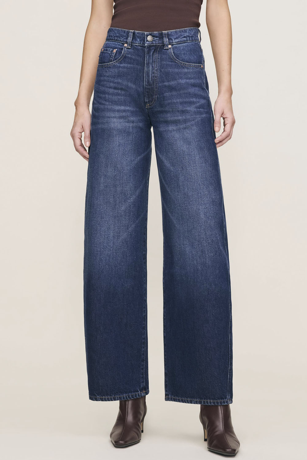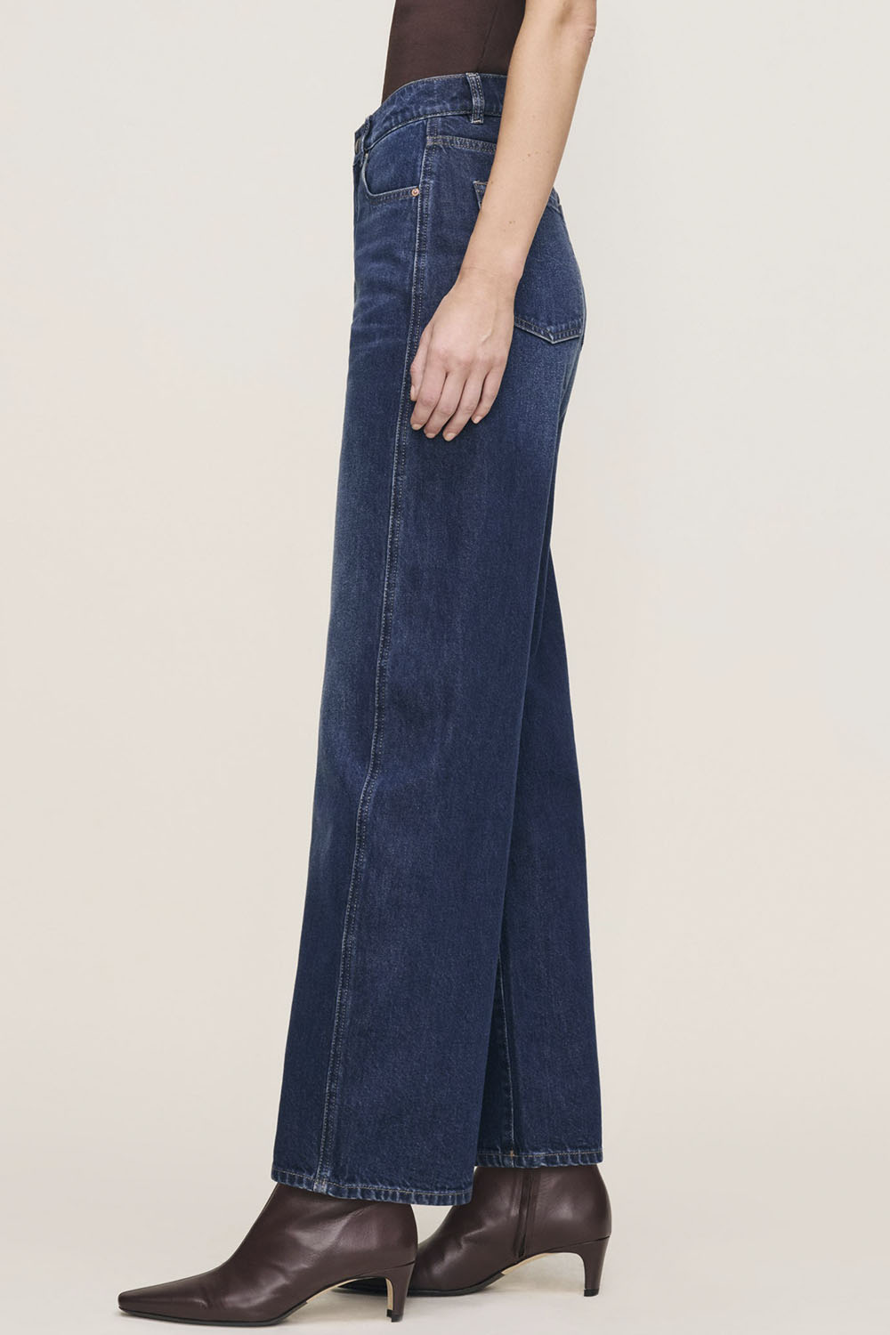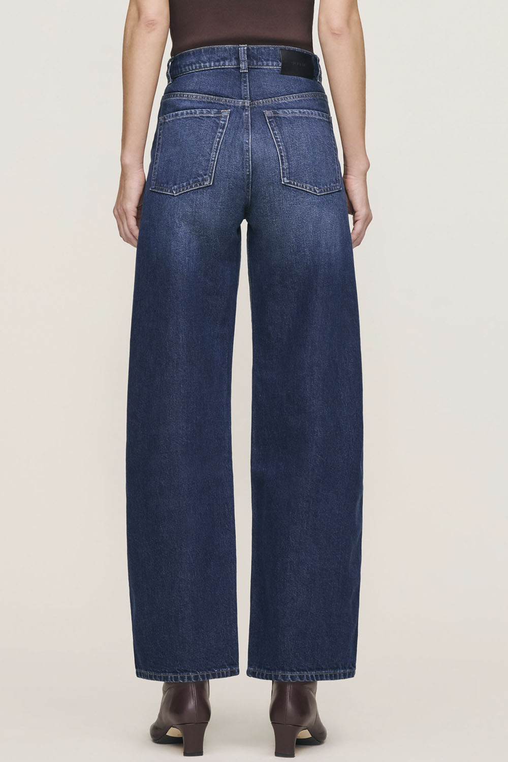 Taylor is a high rise denim with a relaxed barrel leg for an easy laid-back everyday look. Callisto is a midnight blue denim wash featuring silver shank, copper rivets and khaki stitching.