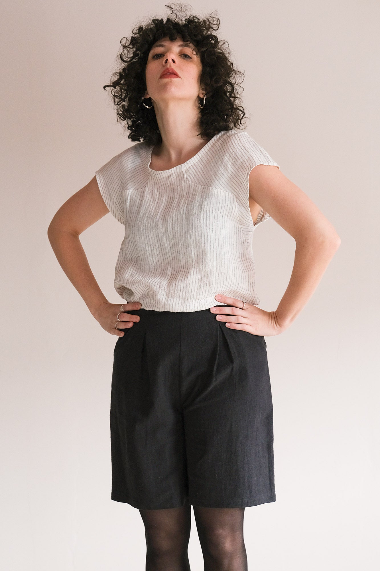 Structured yet comfortable, the Lucina Bermuda Shorts are made from sustainable, breathable ramie. Front pleats and a straight waistband with back elastic and invisible zipper ensure a flattering and comfortable fit, making them perfect for city strolls or relaxed warm-weather moments.