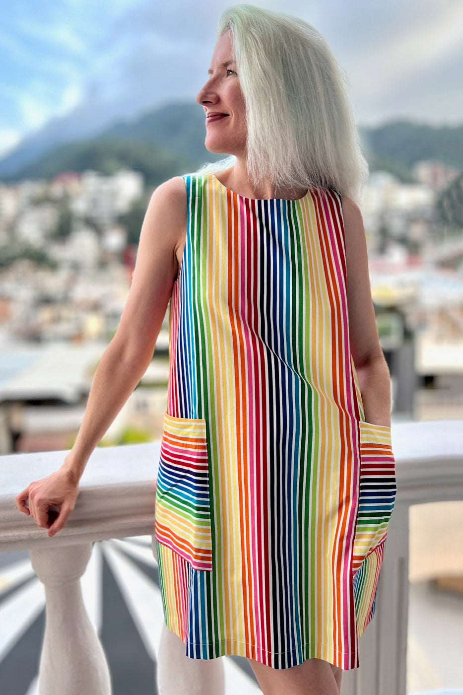 Redpoll is a easy to wear cotton shift dress with front pockets in a summery rainbow stripe.