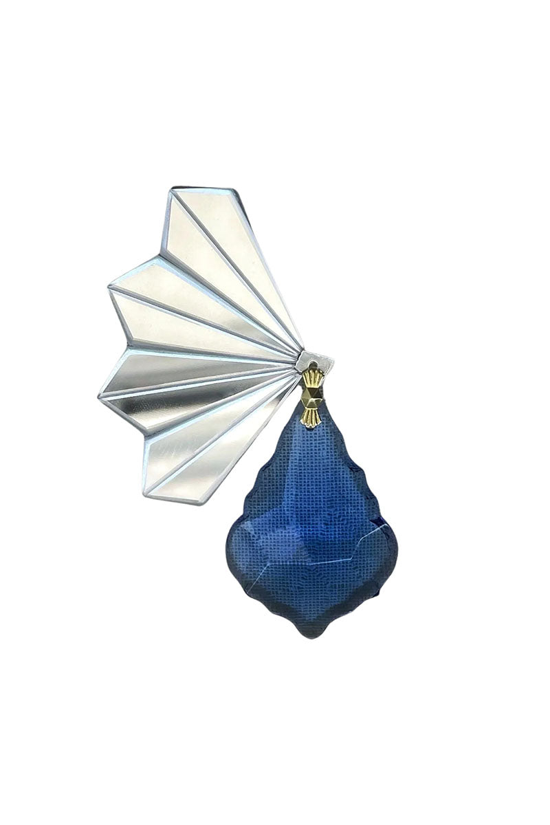 Elevate your outfit with this elegant brooch, featuring a recycled mirrored plexiglass fan and a textured blue pendant.