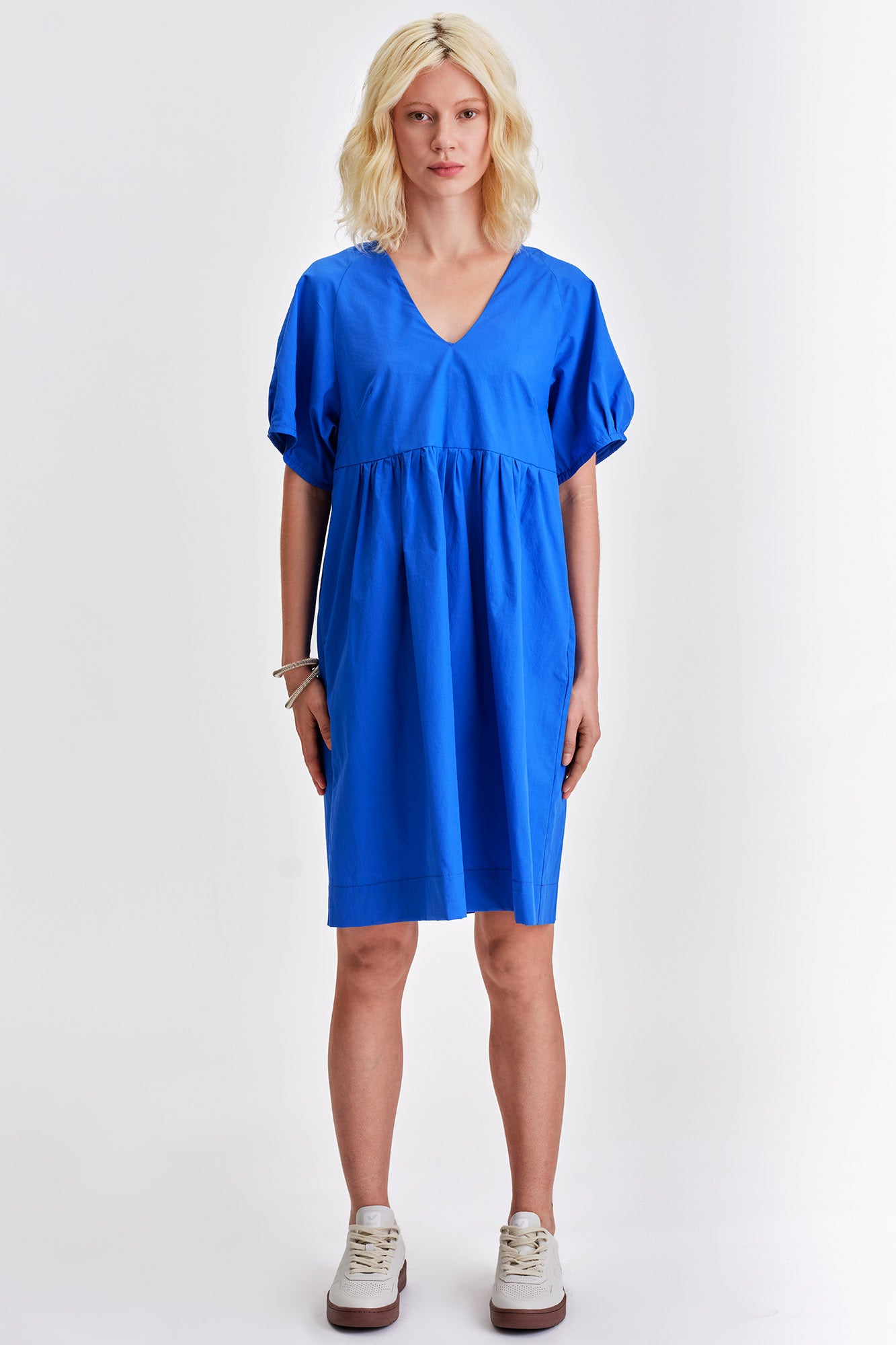Meet Ziva, your new warm-weather favorite. This breezy babydoll-style dress is made from crisp OEKO-TEX® certified cotton poplin, designed to move with you through long summer days. A deep V-neckline, empire waist, and gathered skirt give it a flirty shape, while pleated sleeves and hidden pockets add just the right amount of charm. Easy, flattering, and full of life.