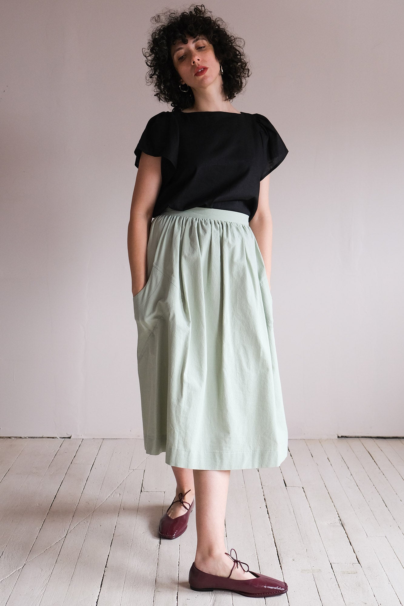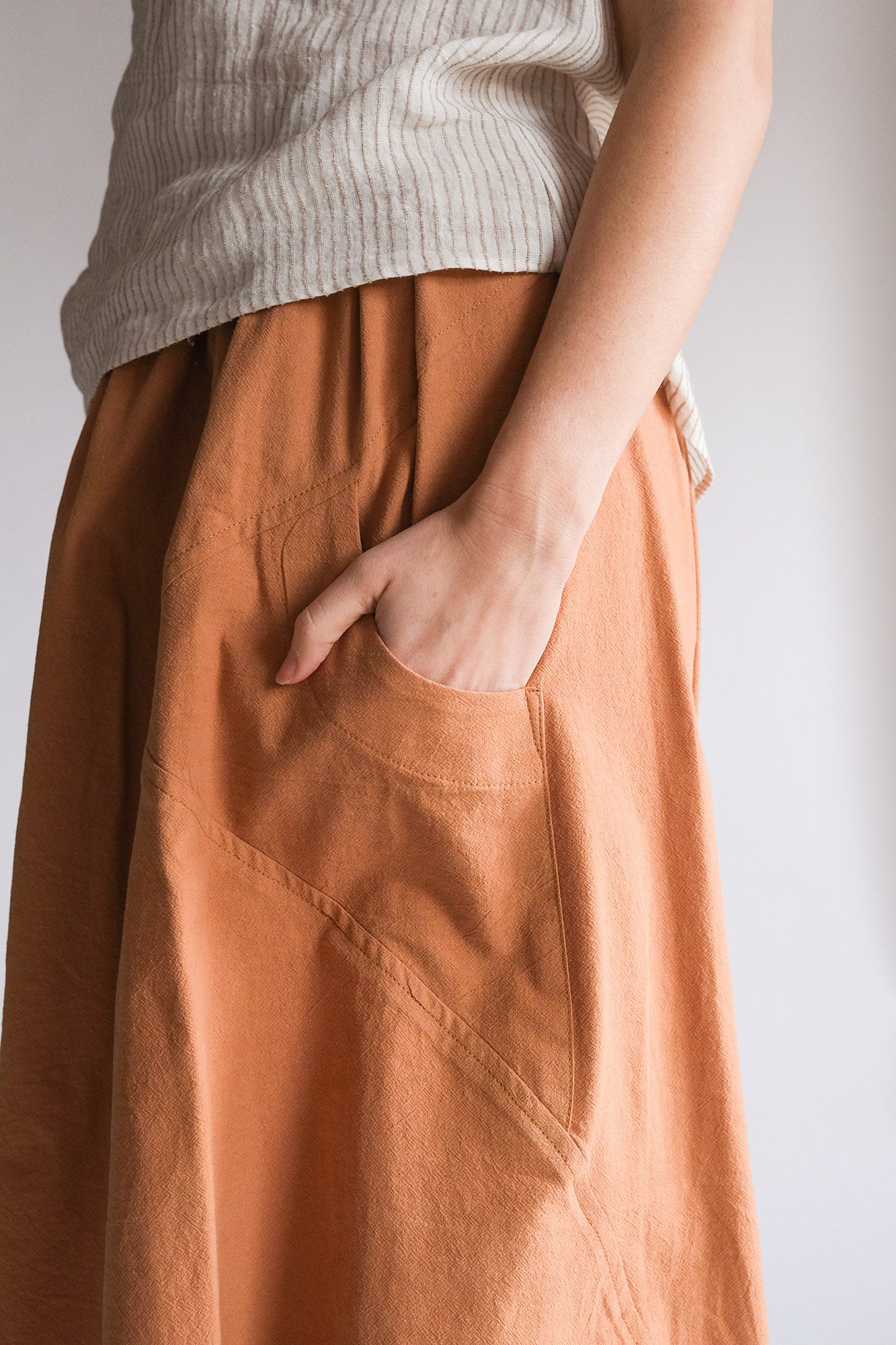 Voluminous yet elegant, the Cyrene Skirt softly gathers at the waist and has clever geometric seams details, and integrated pockets. Crinkled, breathable cotton ensures comfort, while elastic tabs at the back waistband and an invisible zipper create a clean, flattering finish. Available in three versatile colors, it’s a whimsical summer essential.