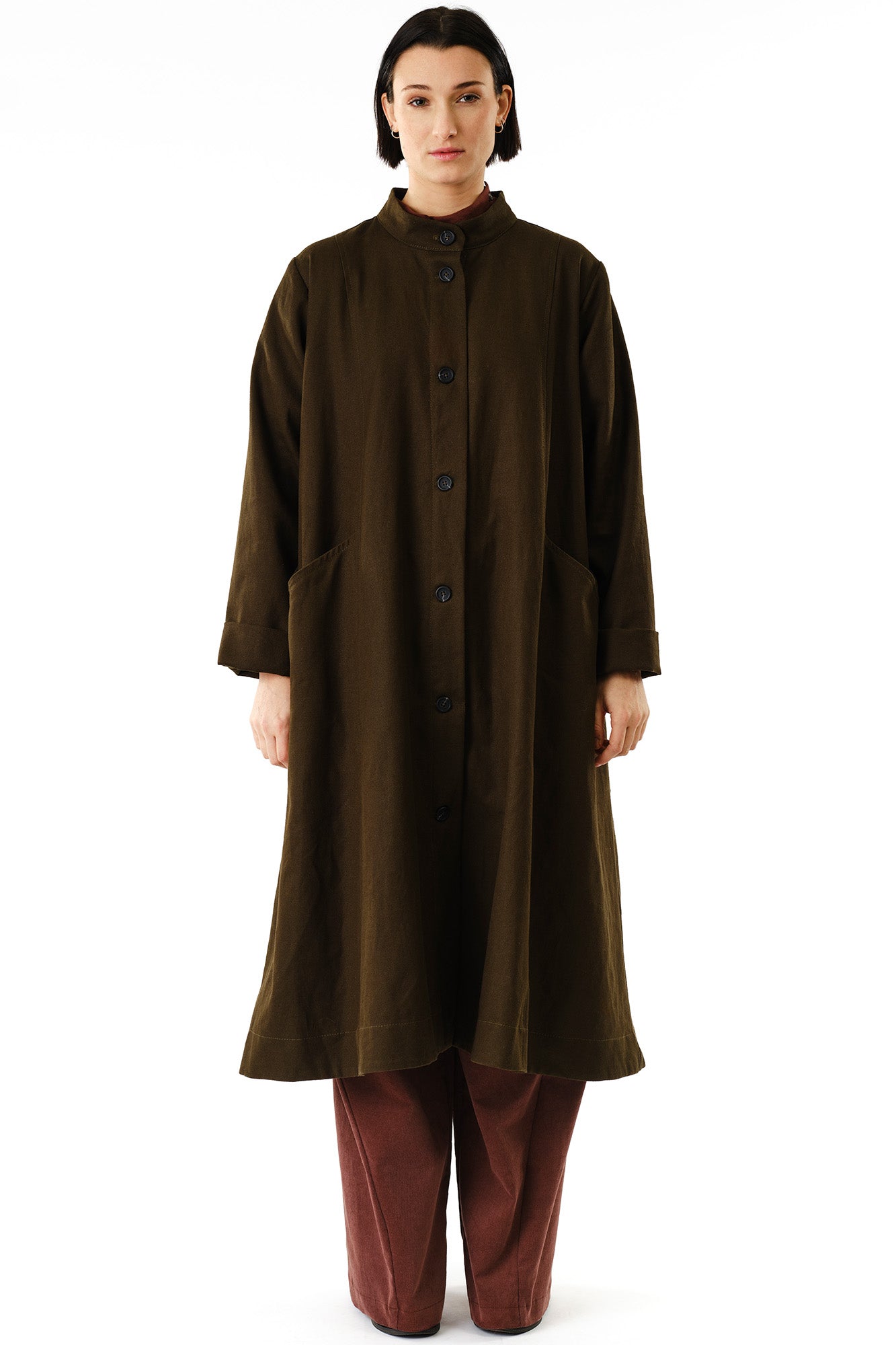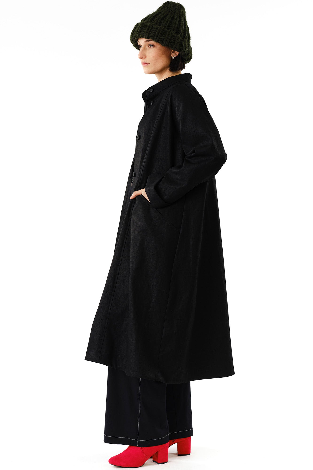 This dramatic oversized swing coat is crafted from a sturdy hemp and organic cotton blend. Featuring a high mandarin collar, angular pockets, and gathered back detail, it balances clean lines with bold volume. The sleeves can be cuffed or left straight for versatile styling.