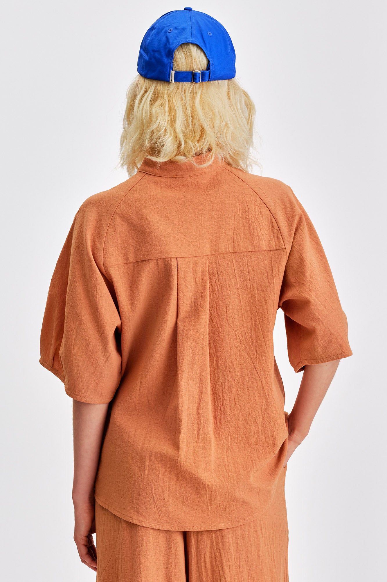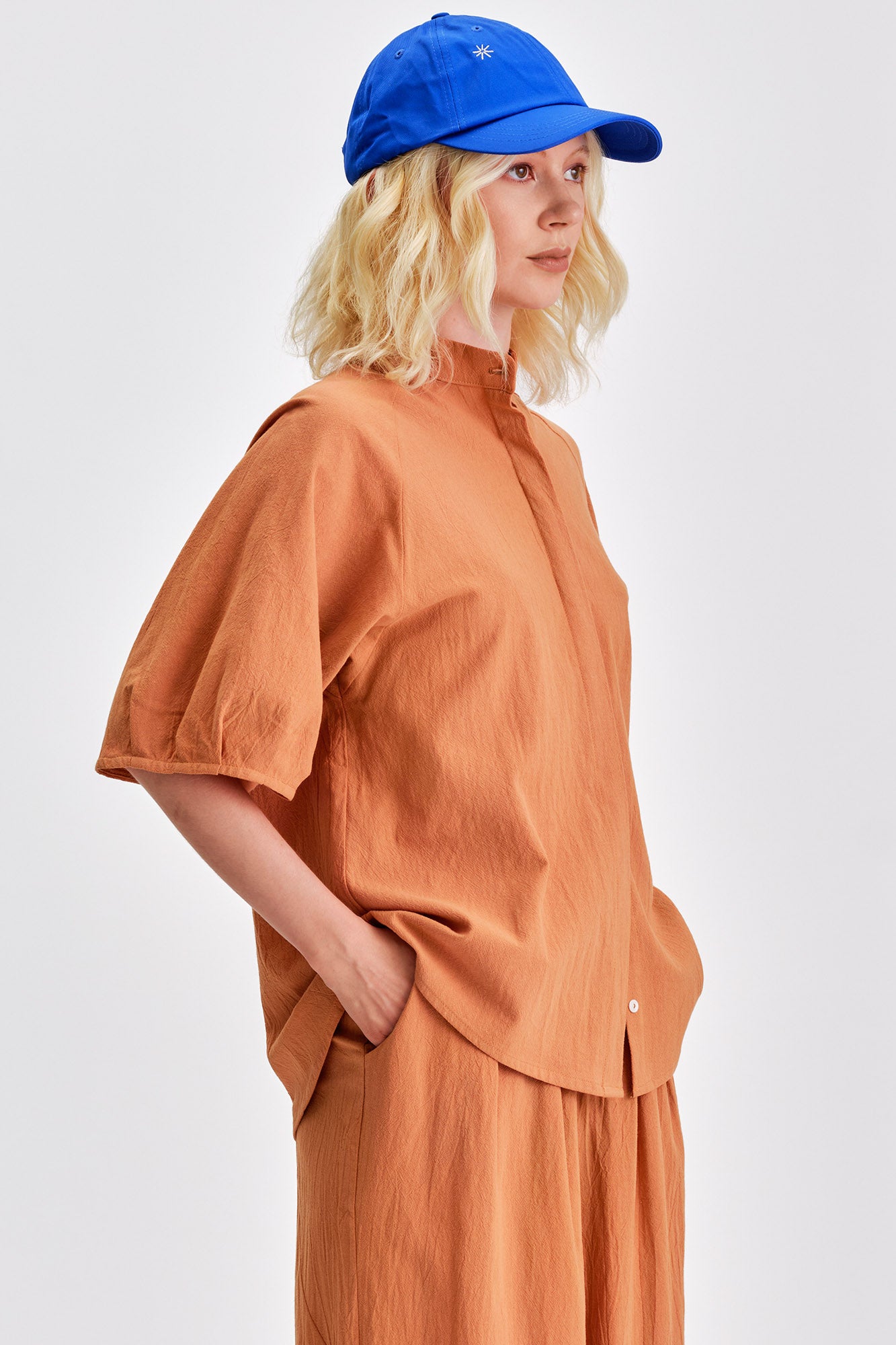 Lightweight and elegant, the Hydra button up is designed for easy summer styling. Its clean covered placket, delicate mandarin collar, and rounded hemline create a streamlined silhouette. Voluminous raglan sleeves are finished with subtle pleats at the opening for a touch of drama, making it a perfect choice for dressing up or down.
