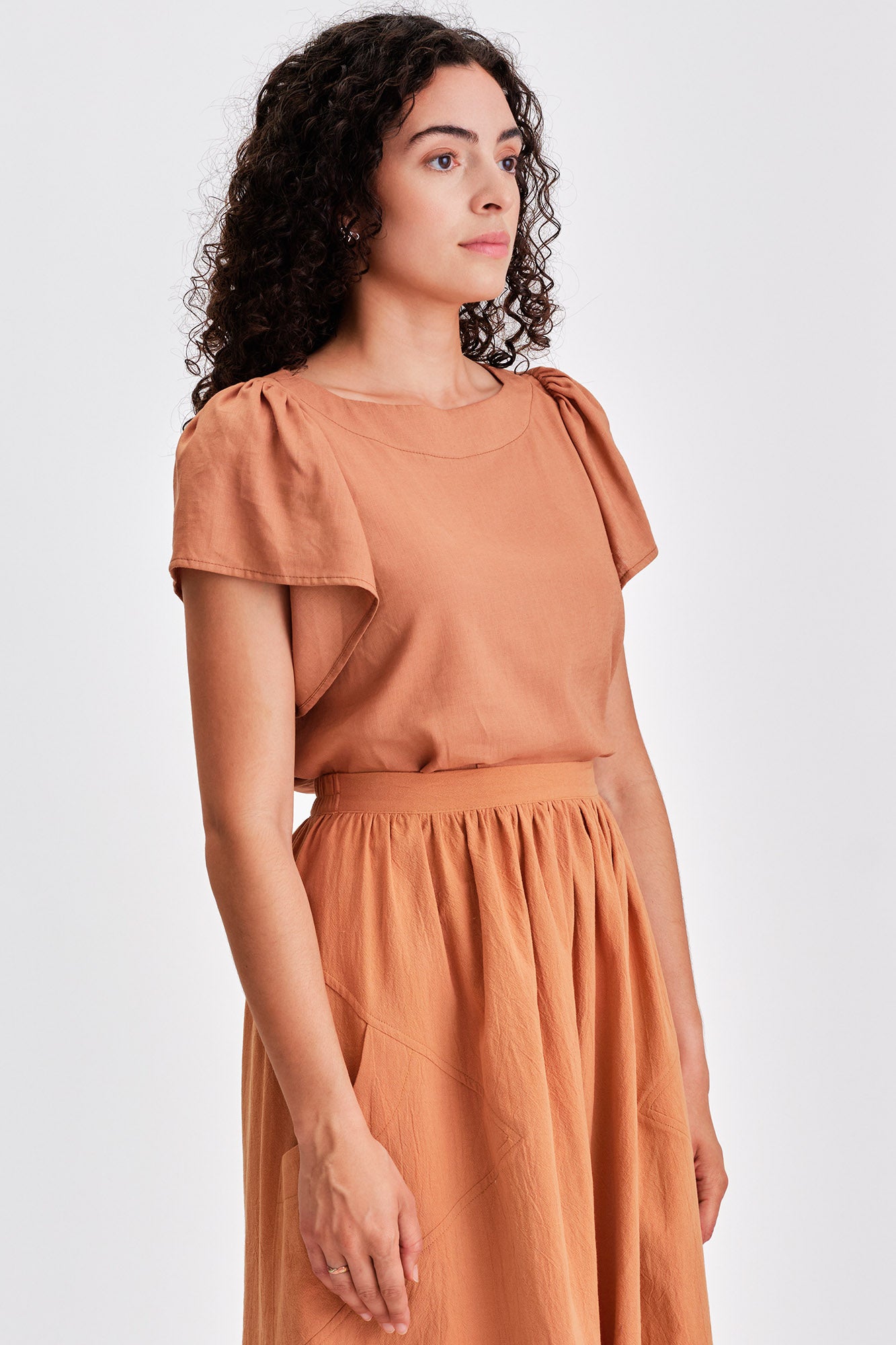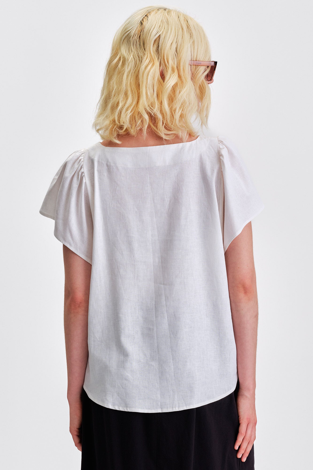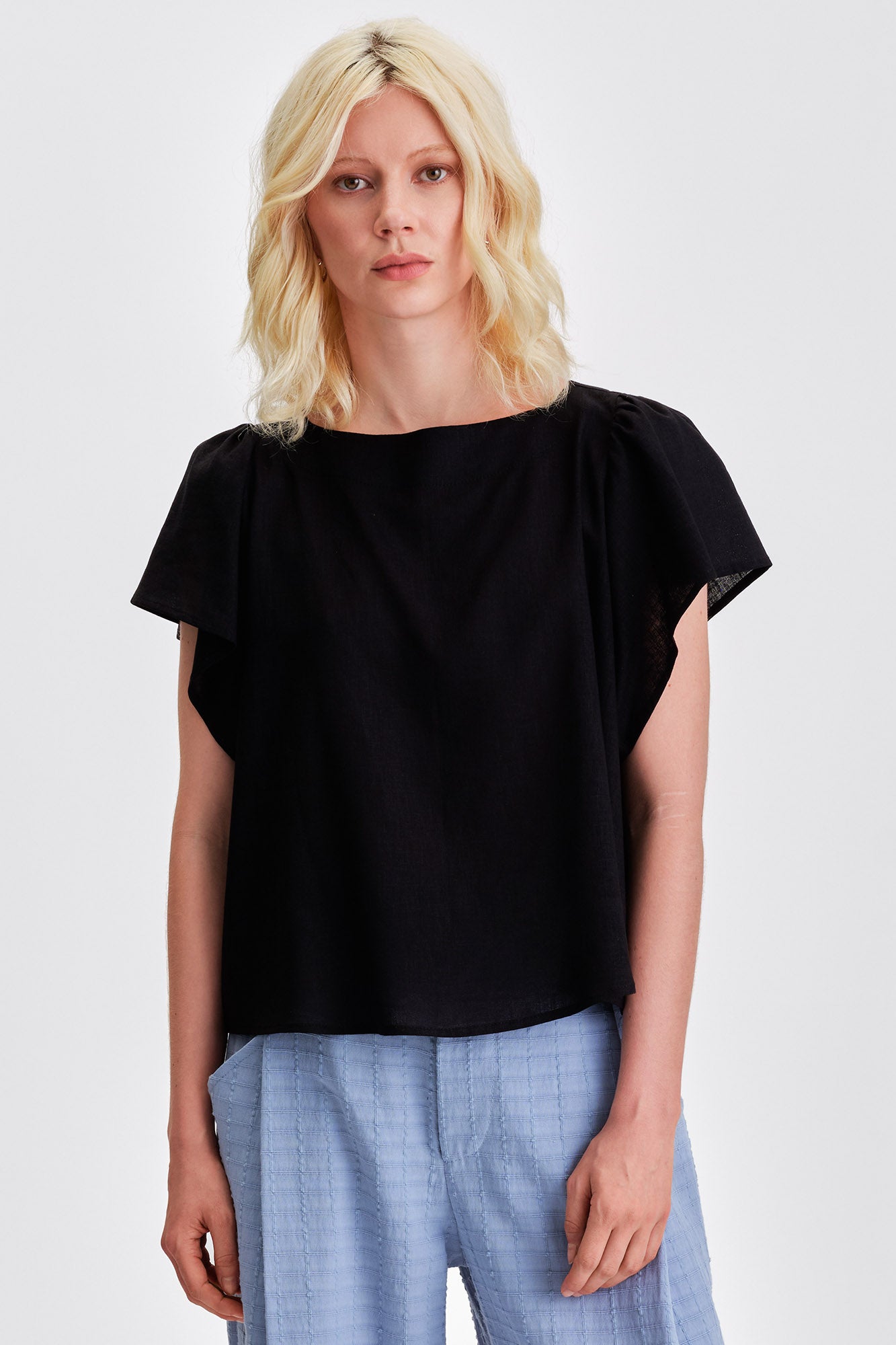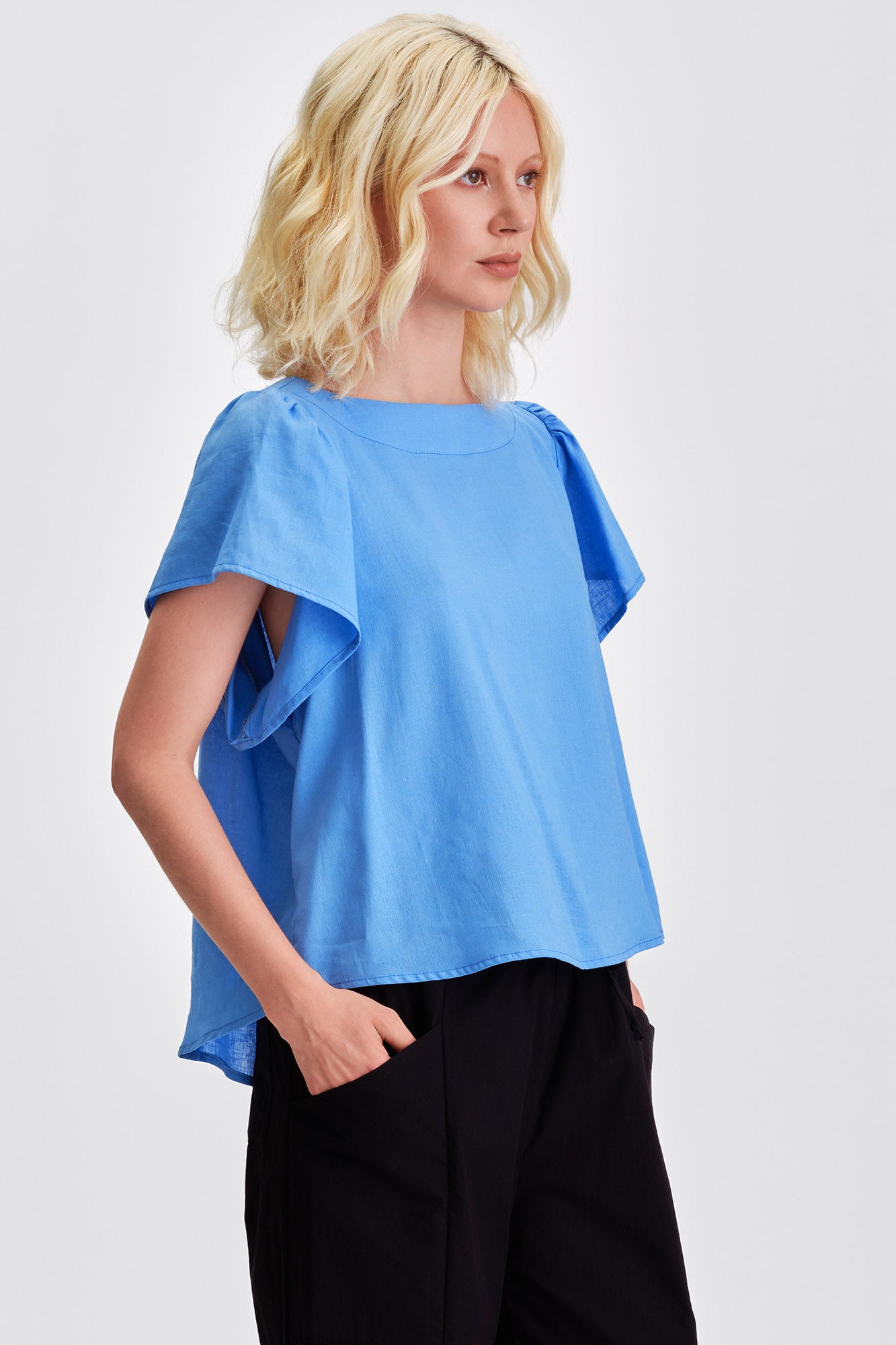 Airy, effortless, and summer-ready, the Saffron blouse is crafted from a lightweight linen blend that drapes softly and keeps you cool. Flutter sleeves, a flattering boatneck, and an oversized waist-length silhouette make it easy to tuck in or wear loose. A versatile essential for elevated warm-weather style.