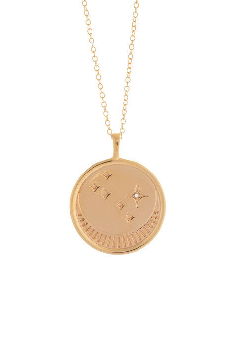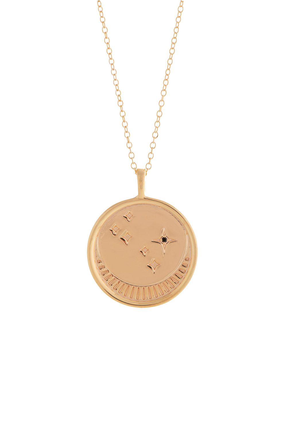 A flat coin shaped pendant necklace featuring star design with black onyx or clear pinky rose quartz stone.