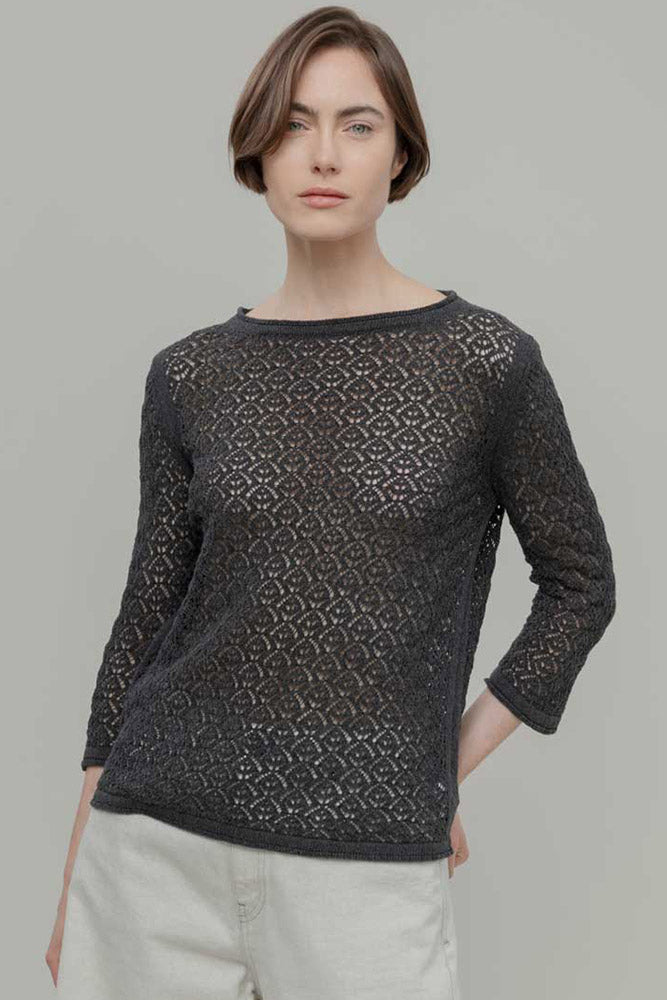 This three-quarter sleeve top will be perfect for summer. Lightweight and with a crocheted texture, it has a vintage feel. It can also be worn layered over a light, fitted shirt, a camisole, or a simple t-shirt.