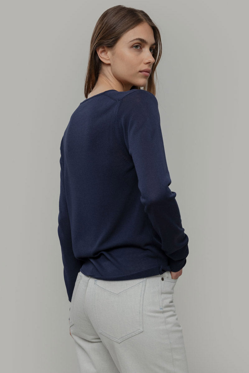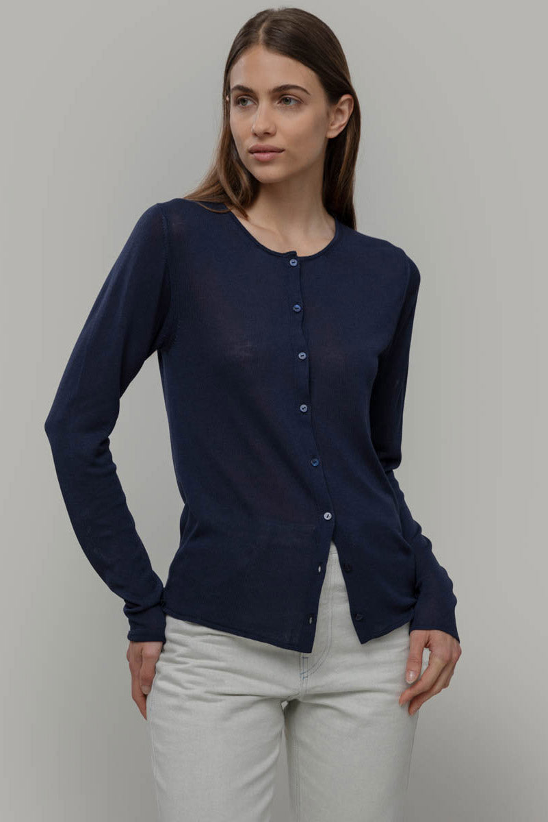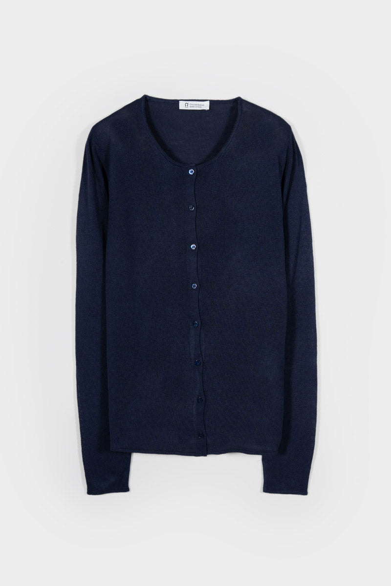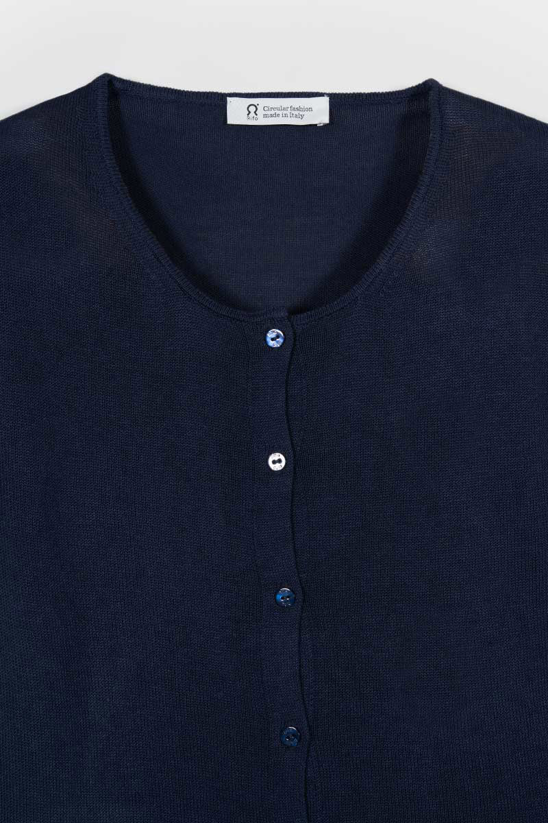 Vanessa is a classic crewneck buttoned cardigan made from partially recycled viscose yarn, making it lightweight and perfect for summer.