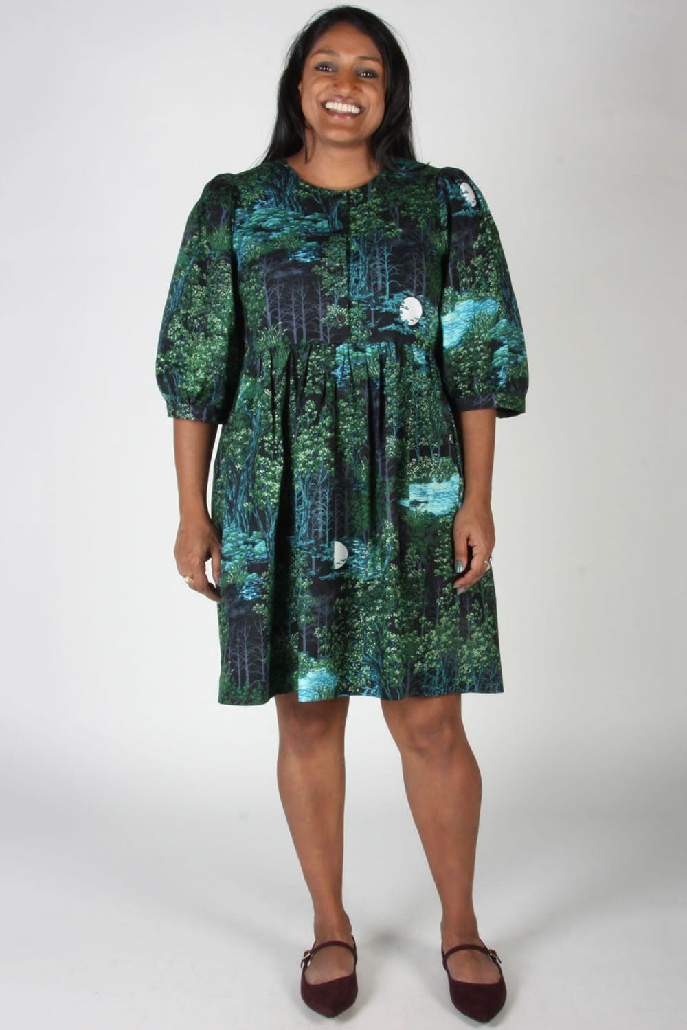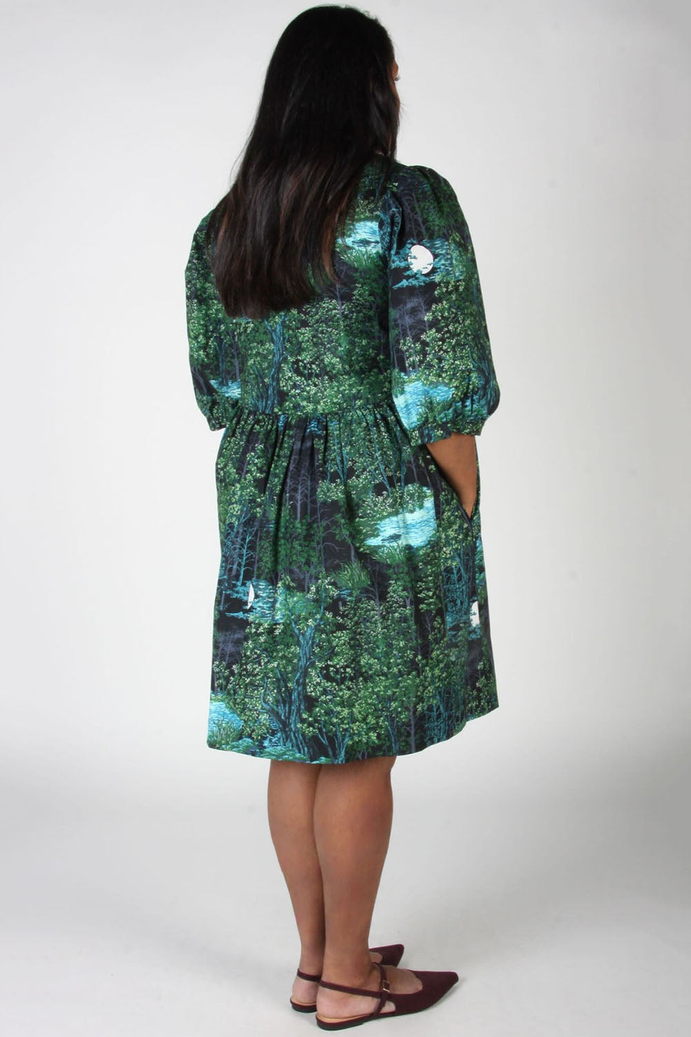 Cinnamon Bittern is a relaxed fit dress with full sleeves, loose gathered waist and large side pockets.