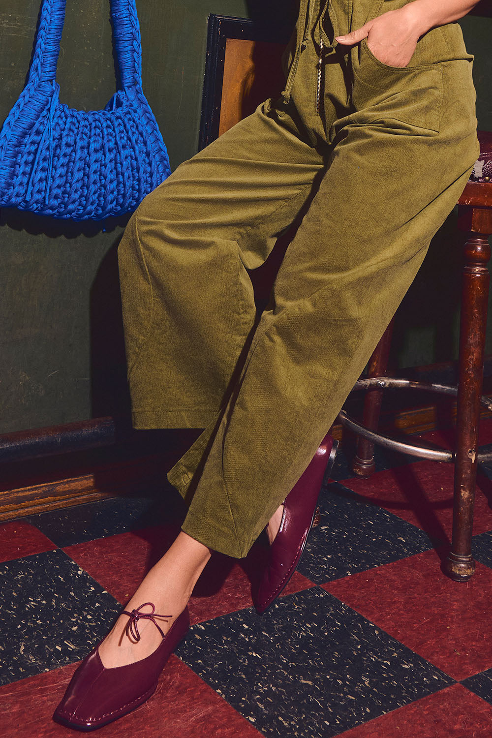 Les souliers Sway sont des ballerines à bout carré avec une empeigne en V et un nœud sur le cou-de-pied, confectionnées dans un cuir durable de couleur bordeaux foncé.