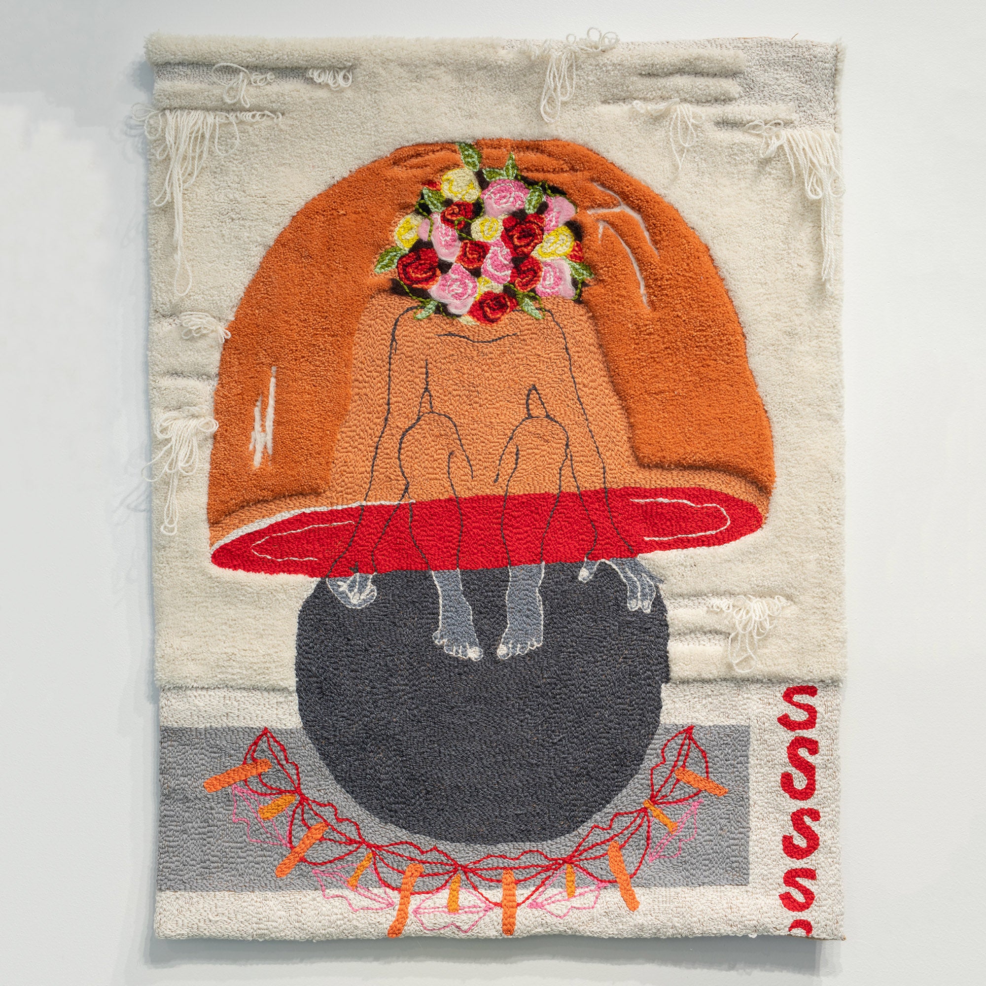 Dome est fabriqué à partir de laine 100 % québécoise. Réalisé à l'aide d'une technique combinant le punch needle et le tufting, il représente une figure protégée, assise au-dessus d'un bavardage de lèvres médisantes. Imperturbable face à ces commérages, l'Être s'agrippe fermement à la sphère d'une main résolue. L'explosion de fleurs symbolise la force vitale créatrice.